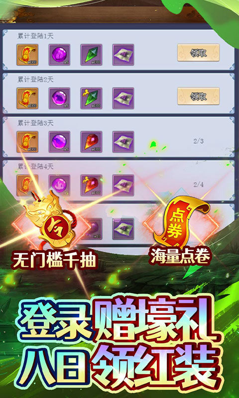 ★【登陆赠壕礼】:登陆直接领取点券卡,第八日更有红装宝箱!