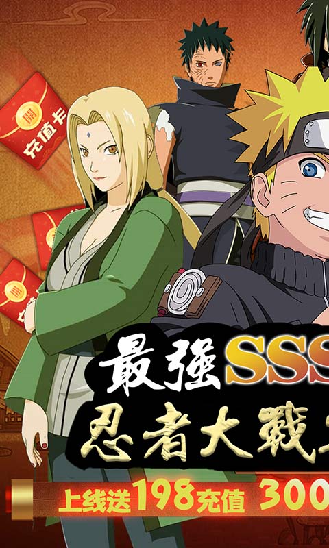 ★正版火影动漫授权;上线送198元真充值卡,使用既得99000钻石、300万金币、直升VIP10;